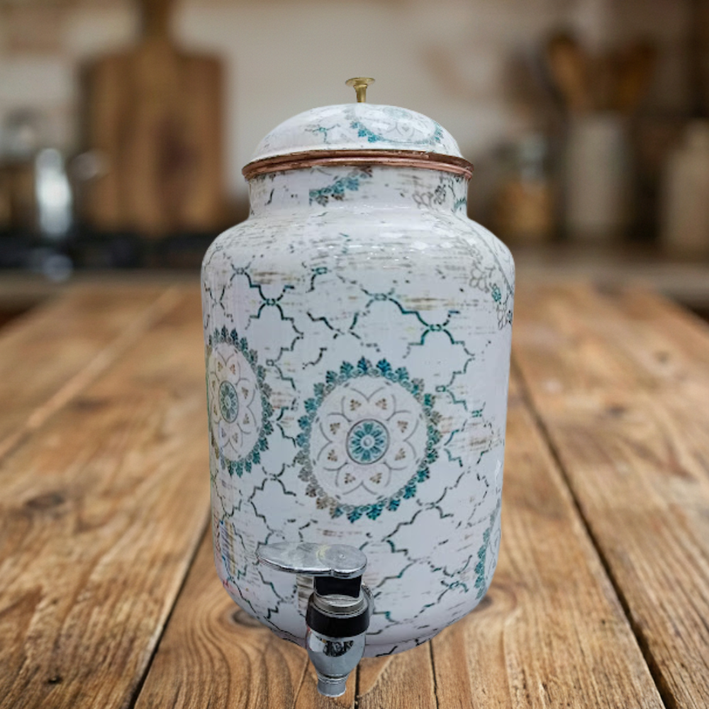 The Tivra #T022 Meena Copper Water Dispenser is a premium large-capacity copper vessel, inspired by traditional Meenakari craftsmanship and designed for modern wellness needs. Crafted from 99% pure copper, this 4-litre dispenser is ideal for family use, offices, hotels, and wellness spaces, combining beauty with functionality.